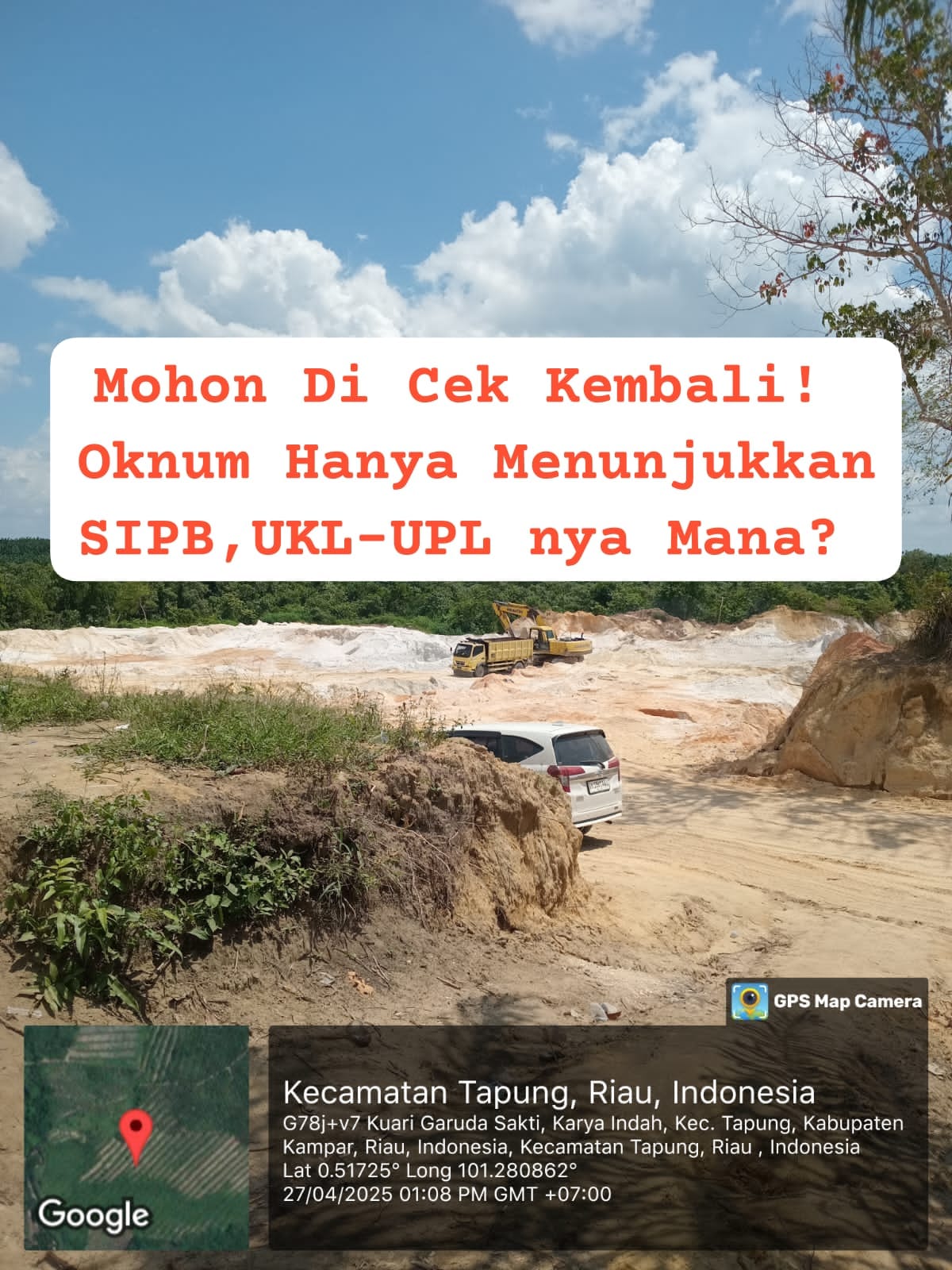 Kampar (Koalisinews.vom), – Perkembangan terbaru terkait aktivitas galian tanah timbunan di Desa Karya Indah, Kecamatan Tapung, Kabupaten Kampar, kian menguak kejanggalan. Setelah sebelumnya penjaga lokasi yang mengaku bernama Ujang tak mampu menunjukkan dokumen perizinan, akhirnya pada Senin, 28 April 2025 sekitar pukul 13.00 WIB, ia memperlihatkan sebuah dokumen berupa SIPB (Surat Izin Penambangan Batuan).