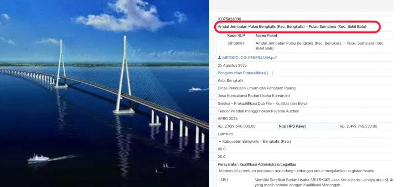 Tender yang tercatat dalam Kode RUP 58138084 itu bersumber dari APBD Kabupaten Bengkalis Tahun 2025 dengan nilai HPS sebesar Rp 2.499.745.530. Meski begitu, hingga kini sumber pendanaan pembangunan fisik jembatan belum jelas apakah akan ditanggung APBN, APBD, atau investasi swasta.