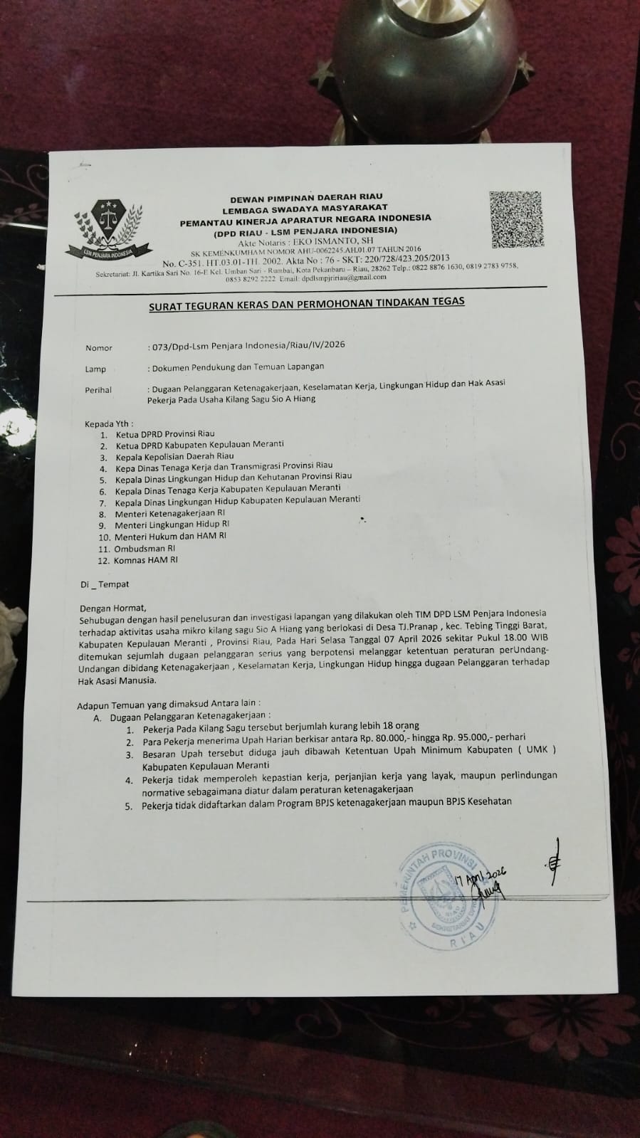 Pekanbaru, (Koalisinews.com), – Dewan Pimpinan Daerah (DPD) LSM Penjara Indonesia Provinsi Riau melayangkan surat teguran keras kepada sejumlah instansi pemerintah terkait dugaan pelanggaran serius di sebuah usaha kilang sagu Sio A Hiang yang berlokasi di Desa Tanjung Pranap, Kecamatan Tebing Tinggi Barat, Kabupaten Kepulauan Meranti. Surat tersebut diterbitkan pada 14 April 2026 setelah tim melakukan investigasi lapangan beberapa hari sebelumnya.
