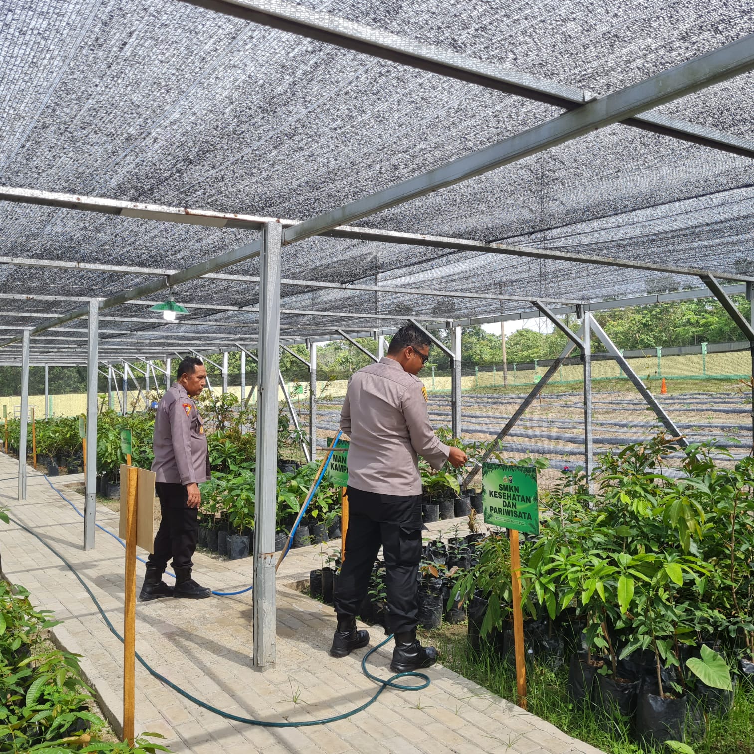 Didampingi Kabag Ops Polres Kampar Kompol Romi Irwansyah, Kapolres Kampar dengan telaten menyirami bibit tanaman yang ada di Bank Pohon.