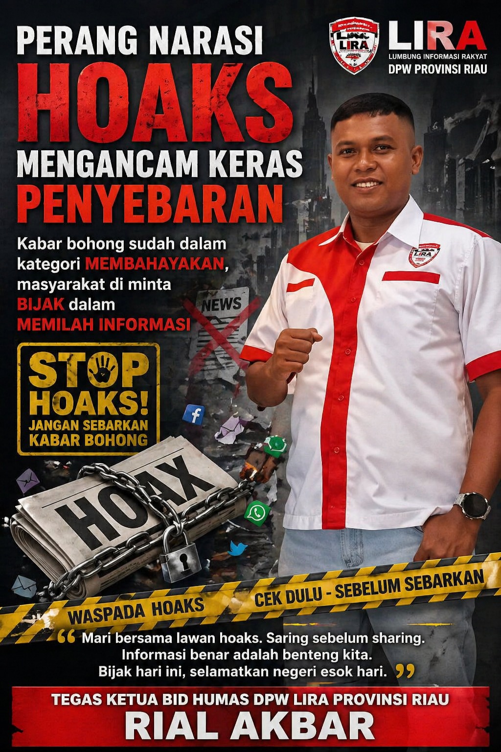 Ketua Bidang Humas DPW Lumbung Informasi Rakyat (LIRA) Provinsi Riau, Rial Akbar ,menegaskan bahwa dampak hoaks di Indonesia sudah sangat nyata dan berbahaya. Kabar bohong yang beredar bebas telah terbukti mampu memicu konflik horizontal di tengah masyarakat dan tidak menutup kemungkinan berujung pada jatuhnya korban nyawa. “Dampak hoaks di Indonesia telah memicu konflik horizontal, tidak tutup kemungkinan sering terjadinya menelan korban nyawa,” tegas Rial.